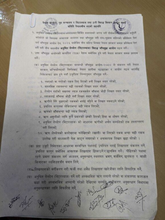 मिटरब्याज तथा ठगीबिरुद्ध किसान मजदुर संघर्ष समिति र सरकारका बिचमा तीन महिनाभित्र जाँचबुझ आयोग गठन गर्ने सहमति भएको छ । ९ विषयको कार्यादेश हुनेगरी जाँचबुझ आयोग गठन गर्न मन्त्रिपरिषद्मा प्रस्ताव लैजाने सहमति भएको छ ।
