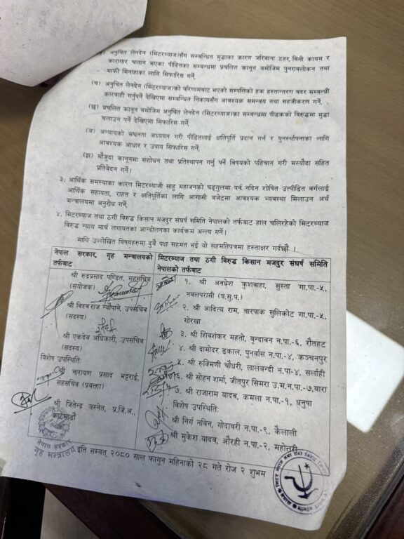 काठमाडौँ । सरकार र मिटरब्याज तथा ठगीविरुद्ध किसान-मजदुर संघर्ष समितिबीच चार बुँदे सहमति भएको छ ।