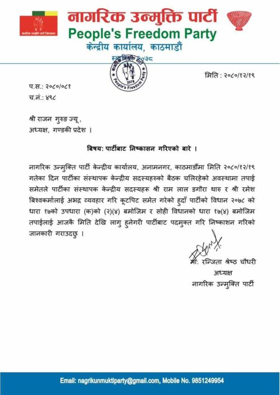 नागरिक उन्मुक्ति पार्टीअध्यक्ष रञ्जिता श्रेष्ठ चौधरीले गण्डकी अध्यक्ष राजन गुरुङ र वाग्मती अध्यक्ष दीपबहादुर योञ्जन तामाङलाई पदमुक्त गरी पार्टीबाट निष्कासन गरेकी छन् ।
