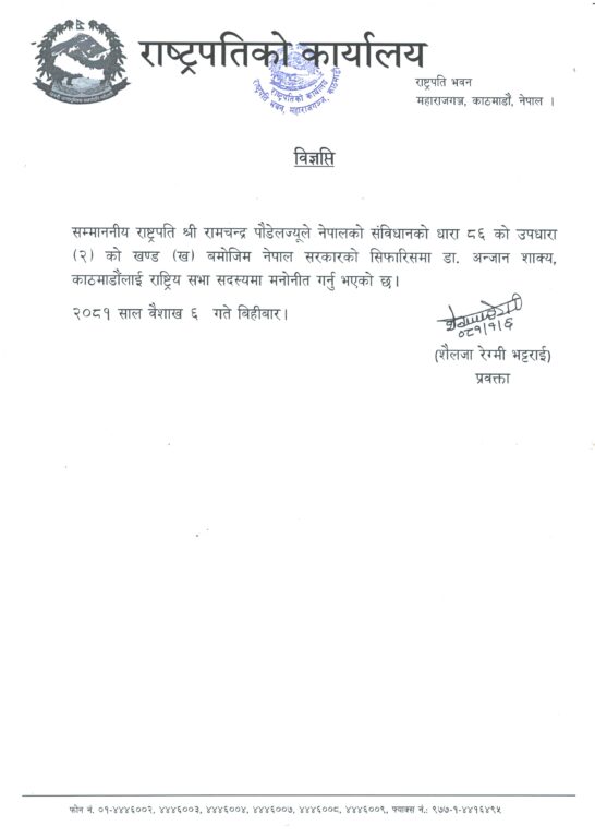 काठमाडौँ । राष्ट्रपति रामचन्द्र पौडेलले सरकारको सिफारिसमा डा.अन्जान शाक्यलाई राष्ट्रिय सभा सदस्यमा मनोनीत गरेका छन् ।