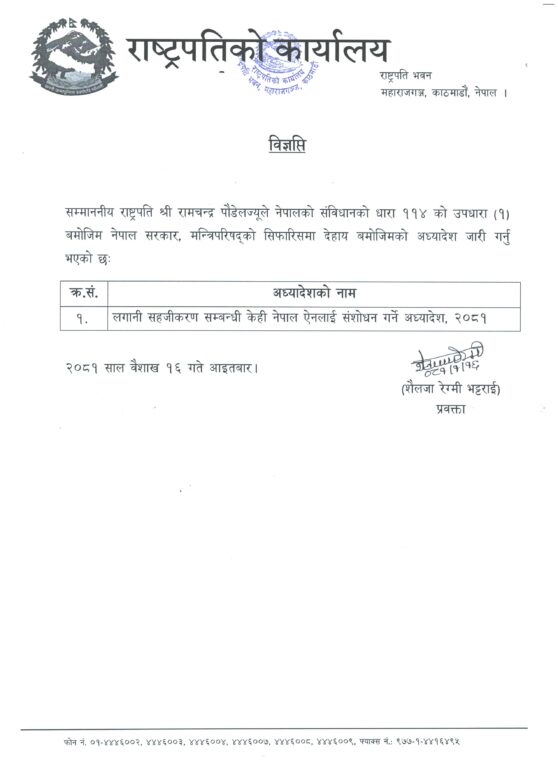 संविधानको धारा ११४ (१) बमोजिम राष्ट्रपतिले आइतबार अध्यादेश जारी गरेको राष्ट्रपति कार्यालयले जनाएको छ ।