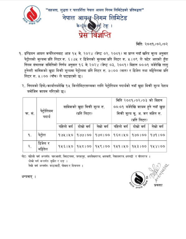 नयाँ मूल्य सूचीअनुसार काठमाडौँ उपत्यकामा पेट्रोलको मूल्य १७१ रुपैयाँ कायम भएको छ भने डिजेल र मट्टितेलको मूल्य १५४ रुपैयाँ कायम भएको छ।