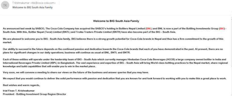 नेपालको व्यवस्थापन हिन्दुस्तान कोकाकोलालाई हस्तान्तरण