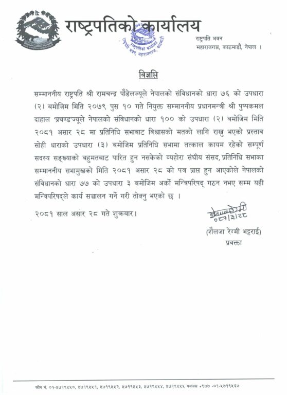“प्रधानमन्त्री दाहालले संविधानको धारा १०० को उपधारा (२) बमोजिम प्रतिनिधिसभाको आजको बैठकमा राख्नुभएको विश्वासको मतसम्बन्धीको प्रस्ताव सोही धाराको उपधारा (३) बमोजिम सभामा तत्काल कायम रहेको सम्पूर्ण सदस्य सङ्ख्याको बहुमतबाट पारित हुन नसकेको व्यहोरा सङ्घीय संसद् प्रतिनिधिसभा सभामुखको यही असार २८ गतेको पत्र प्राप्त हुन आएकाले संविधानबमोजिम यही मन्त्रिपरिषद्ले कार्यसञ्चालन गर्नेगरी तोक्नुभएको छ,” विज्ञप्तिमा उल्लेख छ।