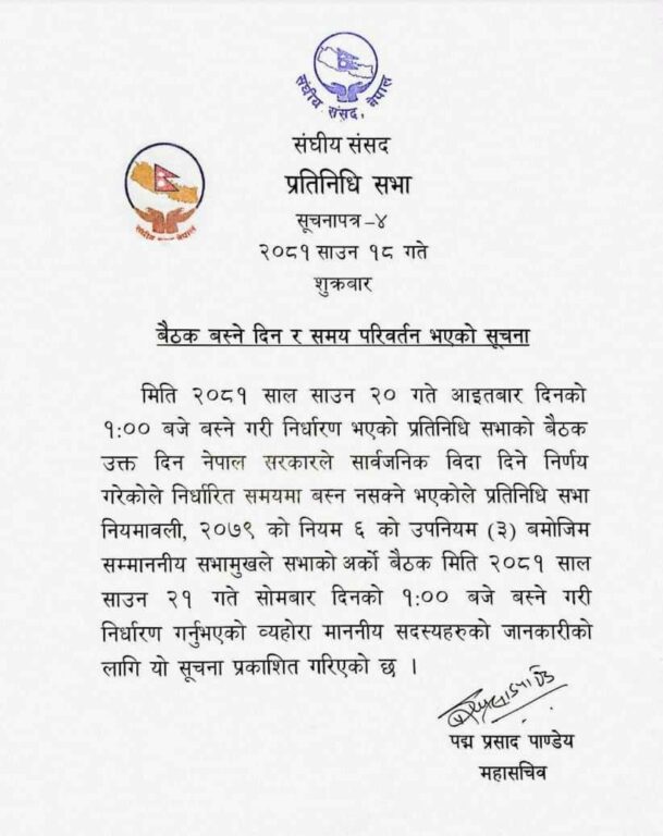 बैठक सोमबार दिउँसो १ बजेका लागि बोलाइएको छ । सरकारले आइतबार सार्वजनिक बिदा दिने निर्णय गरेकाले बैठक सारिएको पाण्डेले जारी गरेको विज्ञप्तिमा उल्लेख छ ।