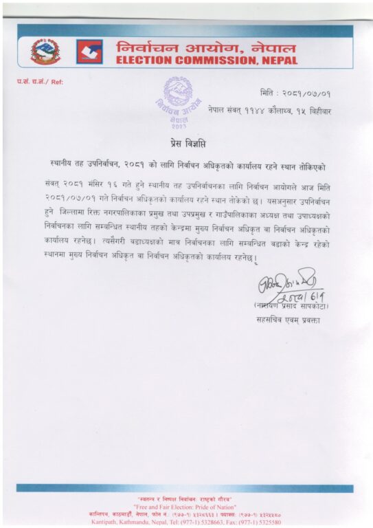 उपनिर्वाचनका लागि निर्वाचन अधिकृतको कार्यालय रहने स्थान तोकियो