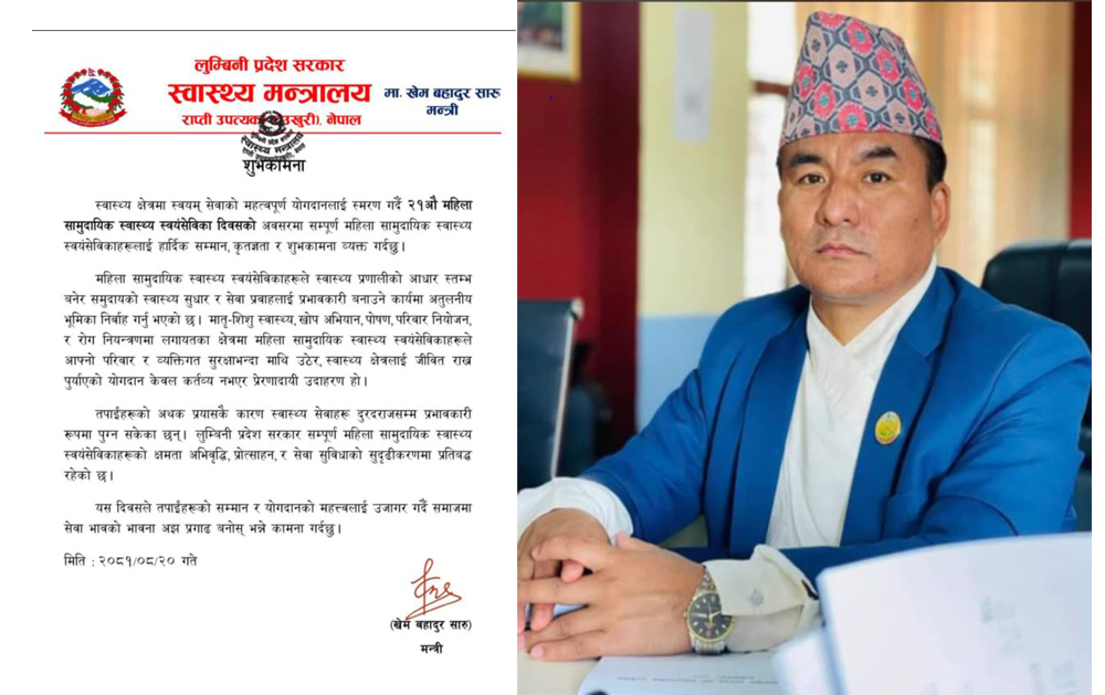 स्वास्थ्य क्षेत्रमा स्वयम् सेवाको महत्त्वपूर्ण योगदानलाई स्मरण गर्दै २१ औं महिला सामुदायिक स्वास्थ्य स्वयंसेविका दिवसको अवसरमा स्वास्थ्य मन्त्री सारुले सम्पूर्ण महिला सामुदायिक स्वास्थ्य स्वयंसेविकाहरूमा सम्मान, कृतज्ञता र शुभकामना व्यक्त गरेका हुन् ।