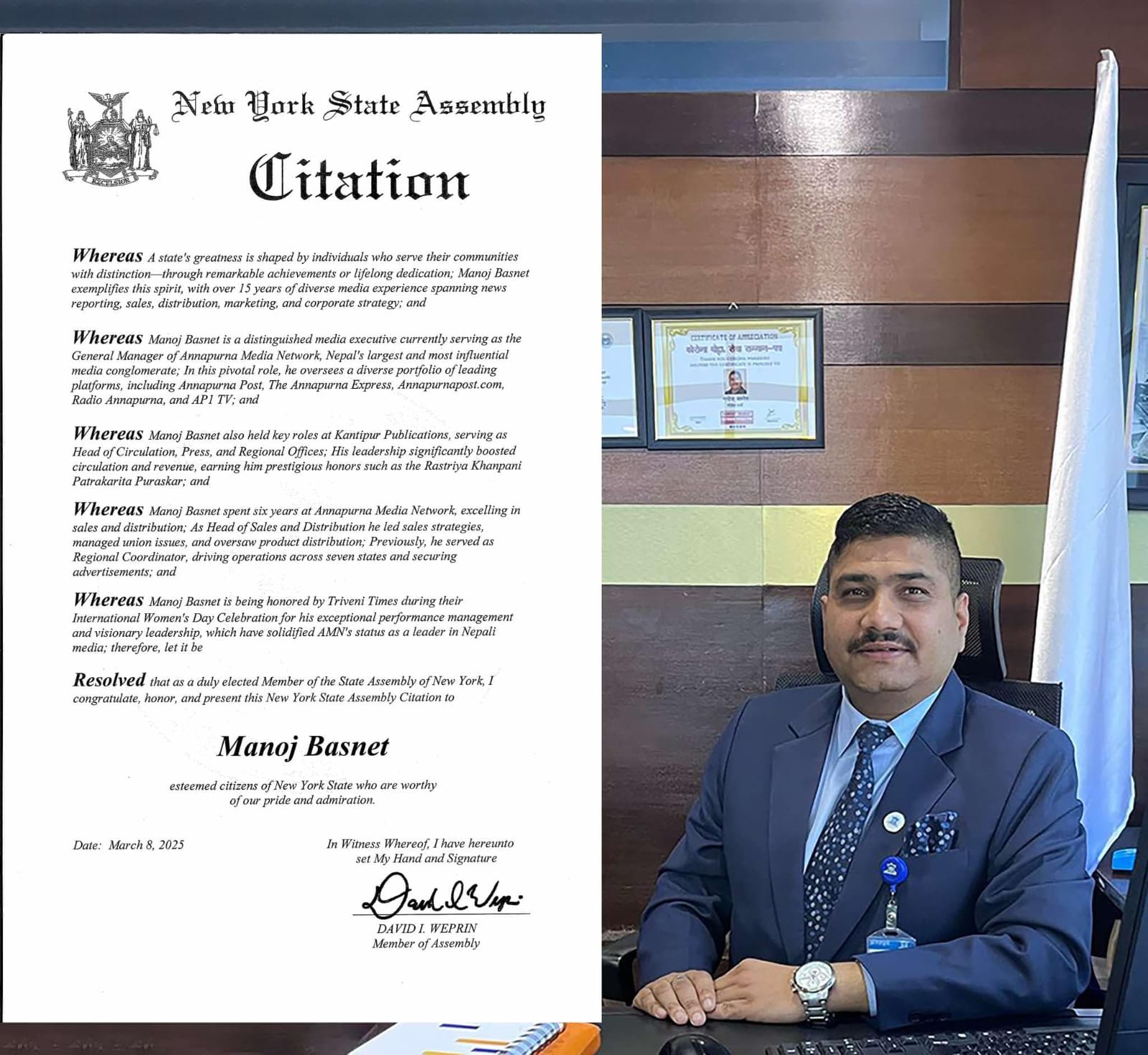 काठमाडाैँ । मिडिया व्यवस्थापनमा उत्कृष्ट कार्यकौशल देखाउदै दुरदर्शी नेतृत्व प्रदान गर्न सफल भएको भन्दै न्यूयोर्क राज्यका एसेम्बली मेम्बर डेभिड आई वेप्रिनले अन्नपूर्ण मिडिया नेटवर्कका महाप्रबन्धक मनोज बस्नेतलाई सम्मानित गरेका छन् ।