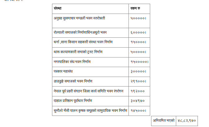 पालिकाले नाफामूलक देखिएका संस्थाहरूलाई ४८ लाख ८२ हजार ९ सय ७० रुपैयाँ बाँडेको छ ।