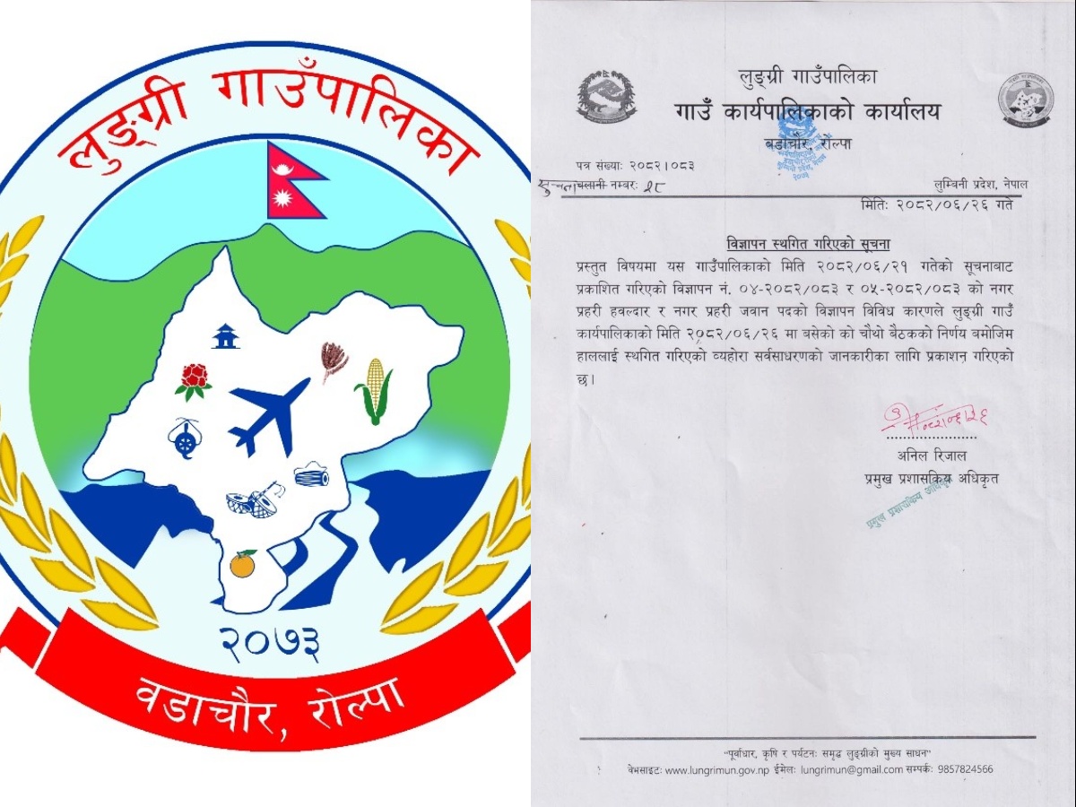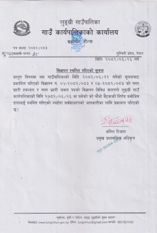 रोल्पाको लुङ्ग्री गाउँपालिकाद्वारा नगर प्रहरी भर्ना प्रकृया स्थागित