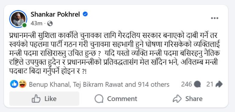 काठमाडौँ । प्रधानमन्त्री सुशिला कार्की नेतृत्वको सरकारले आफूलाई गैरदलीय चुनावी सरकार भनेर प्रस्तुत गर्दै आएको सन्दर्भमा, मन्त्री पदमा रहेका व्यक्तिले नै नयाँ दल गठन गरी चुनावमा सहभागी हुने घोषणा गरिसकेपछि राजनीतिक वृत्तमा छलफल तीब्र भएको छ । यही प्रसंगलाई सम्बोधन गर्दै एमाले महासचिव शङ्कर पोखरेलले सामाजिक सञ्जालमार्फत कडा प्रश्न उठाएका छन् ।