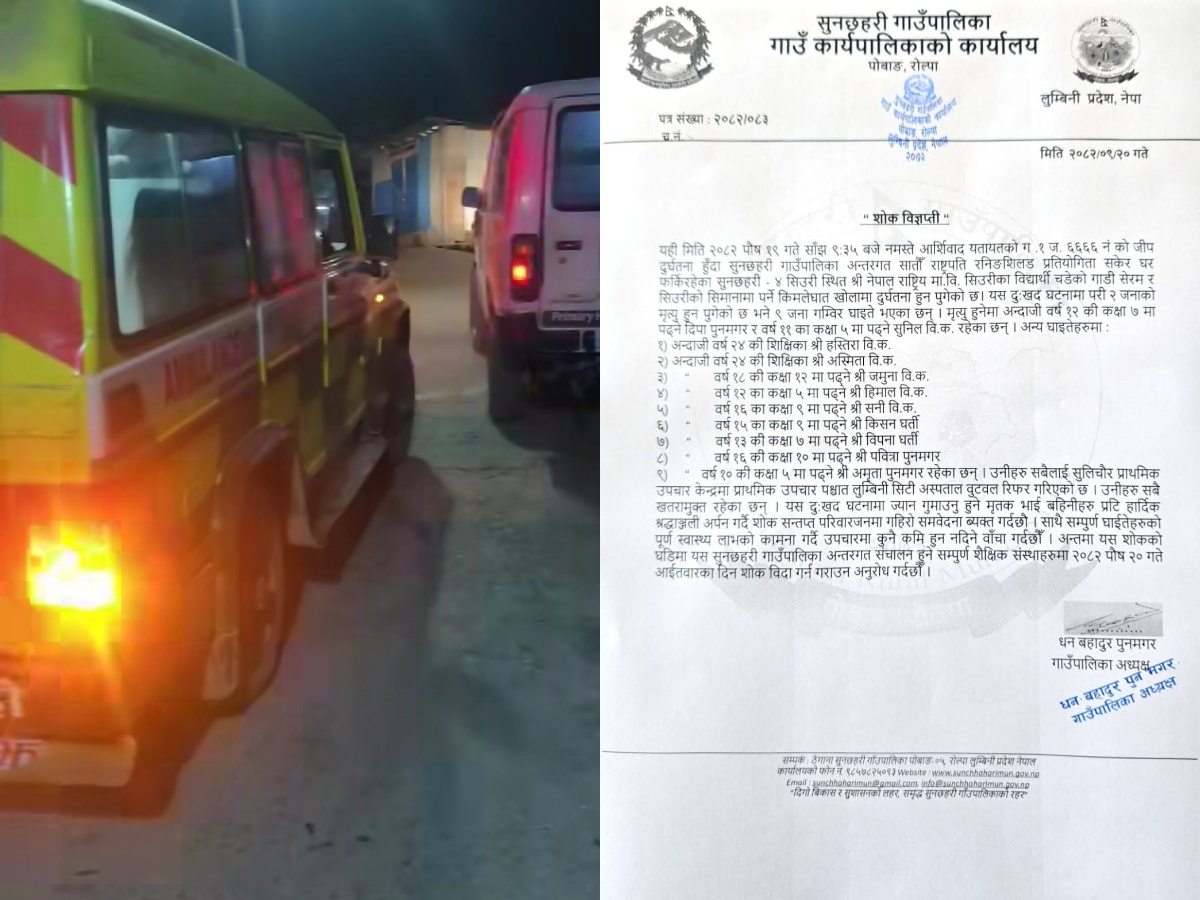 जीप दुर्घटनामा २ विद्यार्थीको मृत्यु भएपछि राेल्पा सुनछहरीका विद्यालयमा शोक विदा