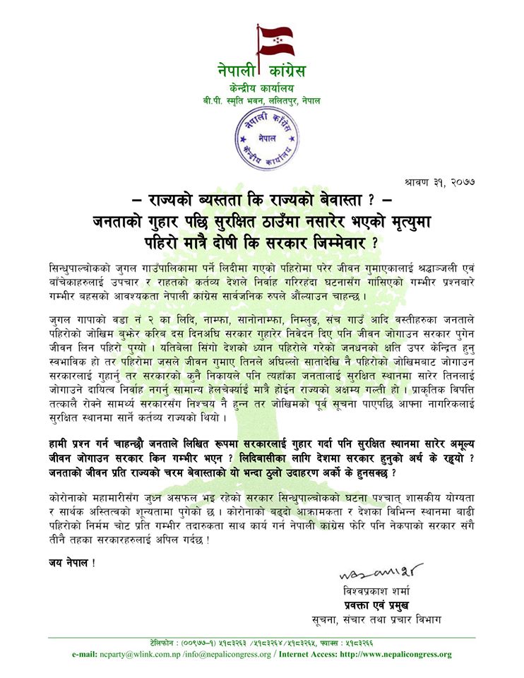 नेपाली कांग्रेसले लिखित रूपमा जनताले सरकारलाई गुहार गर्दा पनि सुरक्षित स्थानमा सारेर अमूल्य जीवन जोगाउन सरकार किन गम्भीर भएन ? भन्दै प्रश्न गरेको छ ।