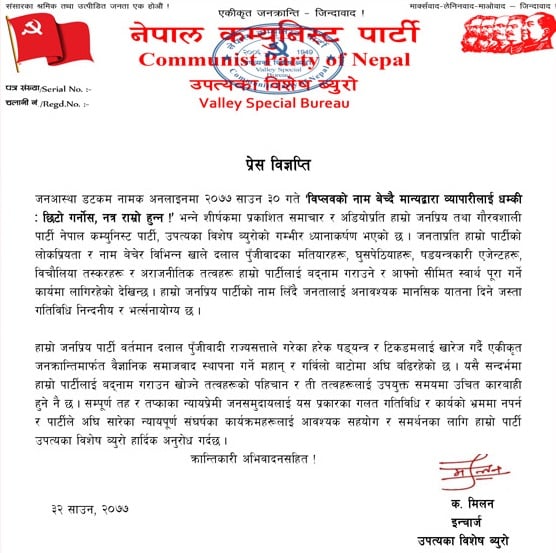 नेकपाका उपत्यका विशेष ब्यूरो इन्चार्ज चिरन पुनले आज प्रेस विज्ञप्ति जारी गर्दै पार्टीको नाम बेचेर विभिन्नखाले अराजनीतिक तत्वहरू आफ्नो निहित स्वार्थ पूरा गर्ने कार्यमा लागेको भन्दै आफ्नो पार्टीको बदनाम गर्ने कार्य निन्दनीय भएको बताएका छन् ।