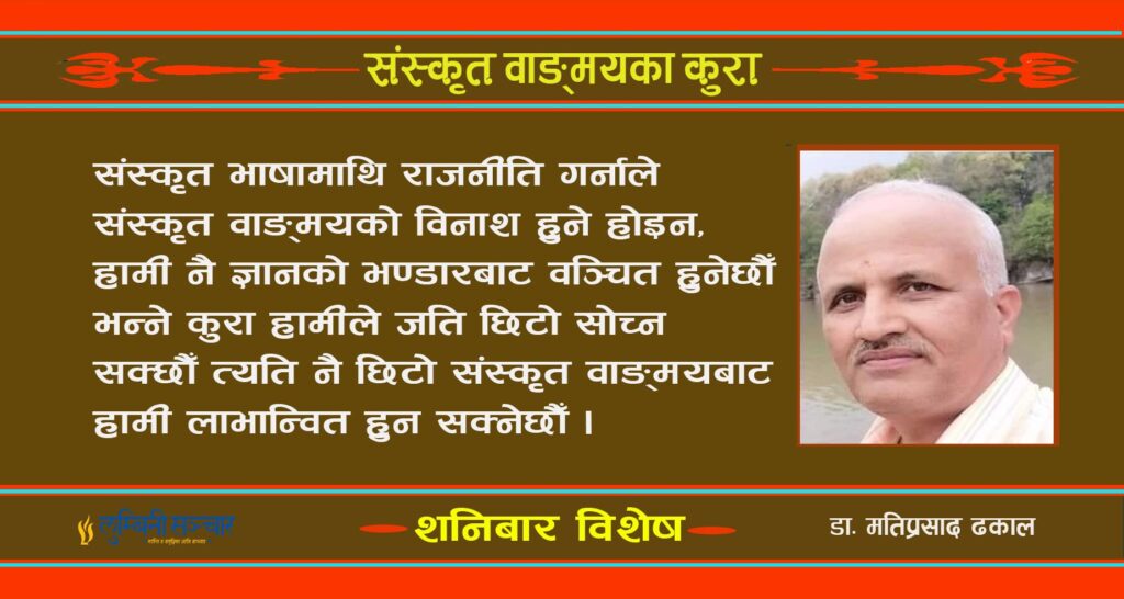 उठान : आजसम्मको अनुसन्धानले संस्कृत भाषा विश्वको सबैभन्दा प्राचीन भाषा मानिन्छ । संस्कृत वाङ्मयले मूल रूपमा सँगालेको विश्वको साझा सम्पत्ति वेद हो । त्यसैले “वेदोऽखिलो धर्ममूलम्” अर्थात् सम्पूर्ण धर्महरूको मूल नै वेद मानिएको छ । विश्वकै अद्वितीय र वैज्ञानिक मानिने पाणिनीय व्याकरण पनि संस्कृतमै भेटिन्छ । वैदिक संस्कृतबाट लौकिक संस्कृत, प्राकृत र अपभ्रंश हुँदै नेपाली, … Continue reading संस्कृत भाषामाथिको राजनीति र यसको प्रभाव