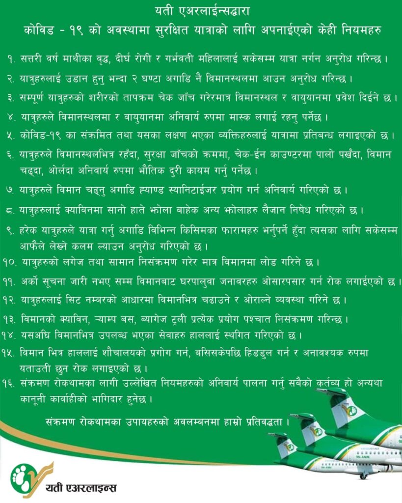 यती एअरलाइन्सले हवाई यात्राका लागि सार्वजनिक गरेको नियमहरु