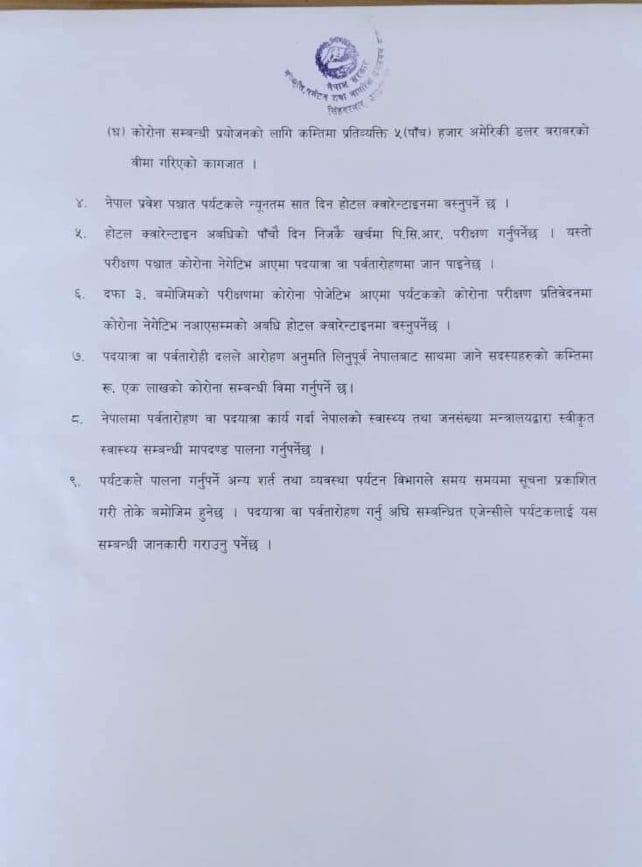 कम्तिमा ७ दिन क्वारेन्टाइनमा रहँदा रहने गरि नेपालमा होटेल बुकिङ गरेको कागजात तथा नेपाल आउनका लागि प्राप्त गरेको भिसा वा पूर्व स्वीकृतिको कागजजात पर्यटकसँग हुनुपर्ने छ । पर्वतारोहण वा पदयात्राका लागि विदेशबाट आउने पर्यटकले नेपाल आउनु अगावै नेपालको भिसा प्राप्त गरेको हुनुपर्ने छ ।