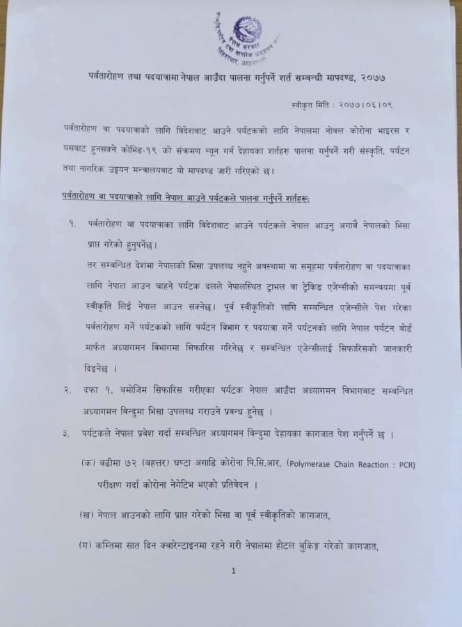 मन्त्रालयले पर्वतारोहण वा पदयात्राका लागि नेपाल आउने पर्यटकहरुले पालना गर्नुपर्ने सर्त तथा मापदण्ड जारी गरेको हो । मापदण्ड अनुसार पर्यटकले नेपाल प्रवेश गर्दा सम्बन्धित अध्यागमन विन्दुमा बढीमा ७२ घण्टा अगाडि कोरोना पीसीआर परीक्षण गर्दा रिपोर्ट नेगेटिभ आएको हुनुपर्ने छ ।