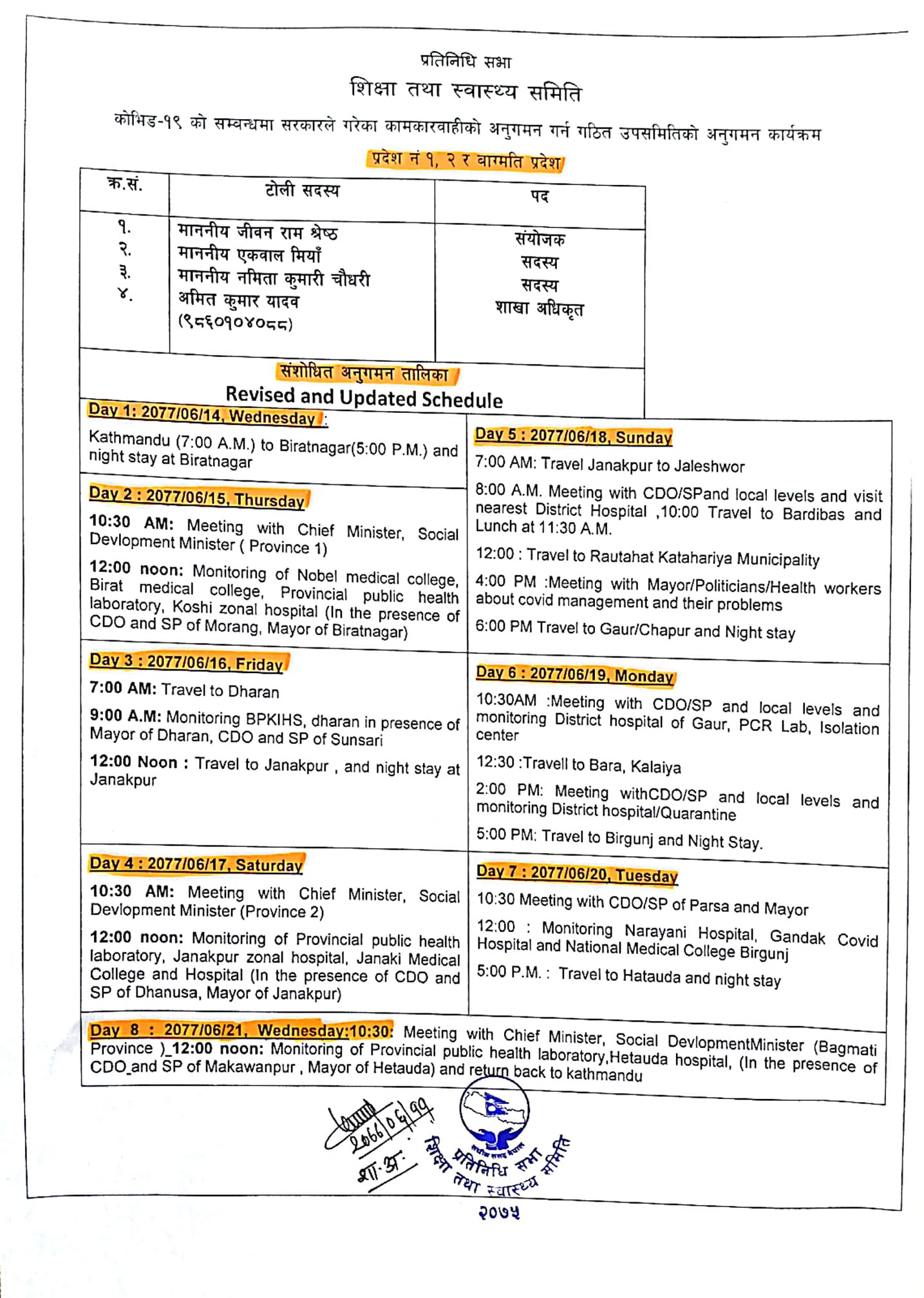 आइतबार महोत्तरी सदरमुकाम जलेश्वर पुग्ने उपसमितिले सीडीयो, प्रहरी प्रमुखसँग छलफल गर्नुका साथै जिल्ला अस्पतालको अनुगमन गर्ने छ । सोही दिन रौतहट रौतहटको कथहरिया नगरपालिका पुगेर त्यहाँको अवस्थाबारे जानकारी लिने कार्यतालिका उपसमितिको छ ।