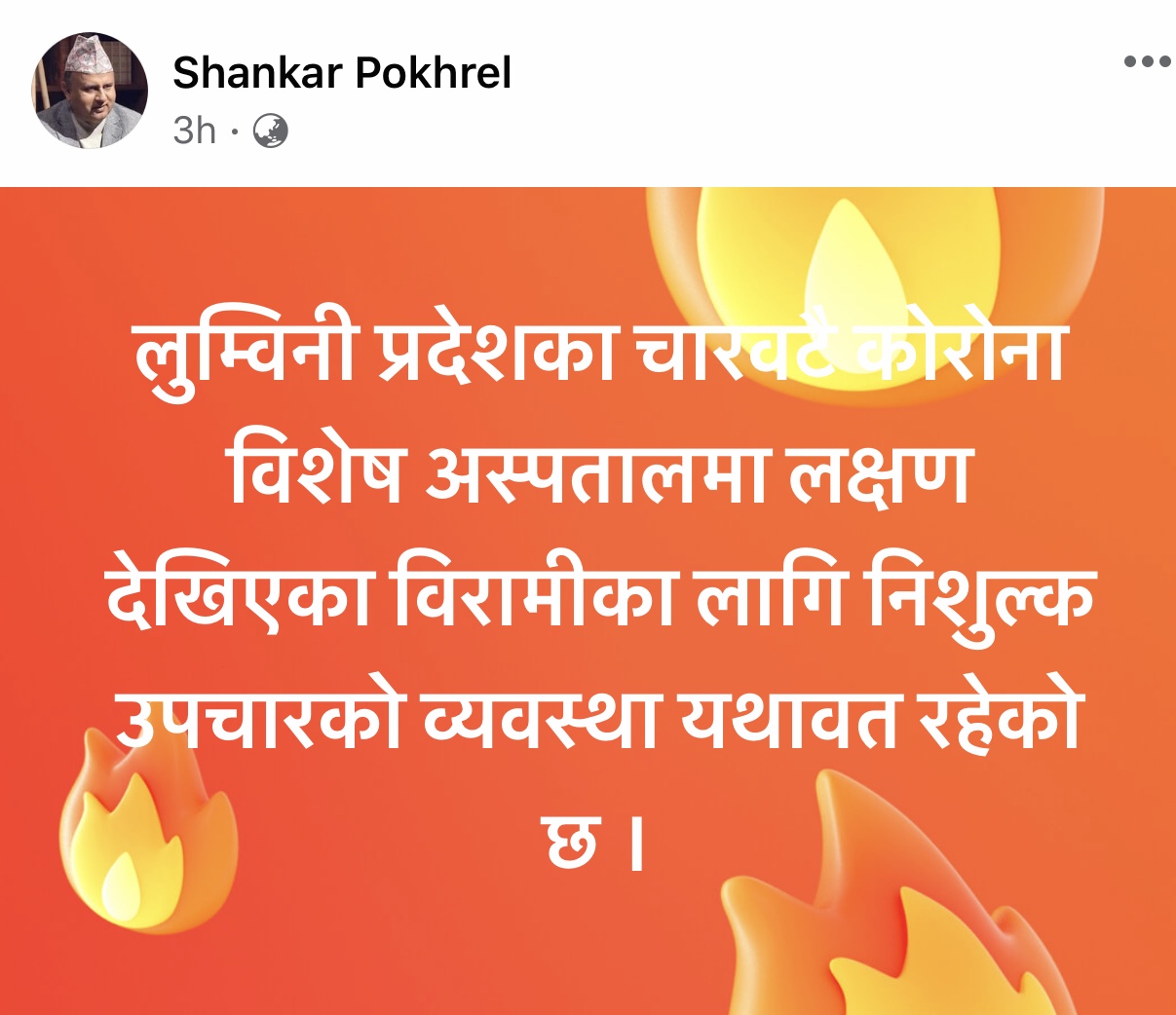 ‘लुम्बिनी प्रदेशका चारवटै कोरोना विशेष अस्पतालमा संक्रमण देखिएकाका परीक्षण र उपचार नि:शुल्क व्यवस्था यथावत रहेको छ,’ सामाजिक संजाल फेसबुकमा मुख्यमन्त्री पोखरेलले लेखेका छन् ।