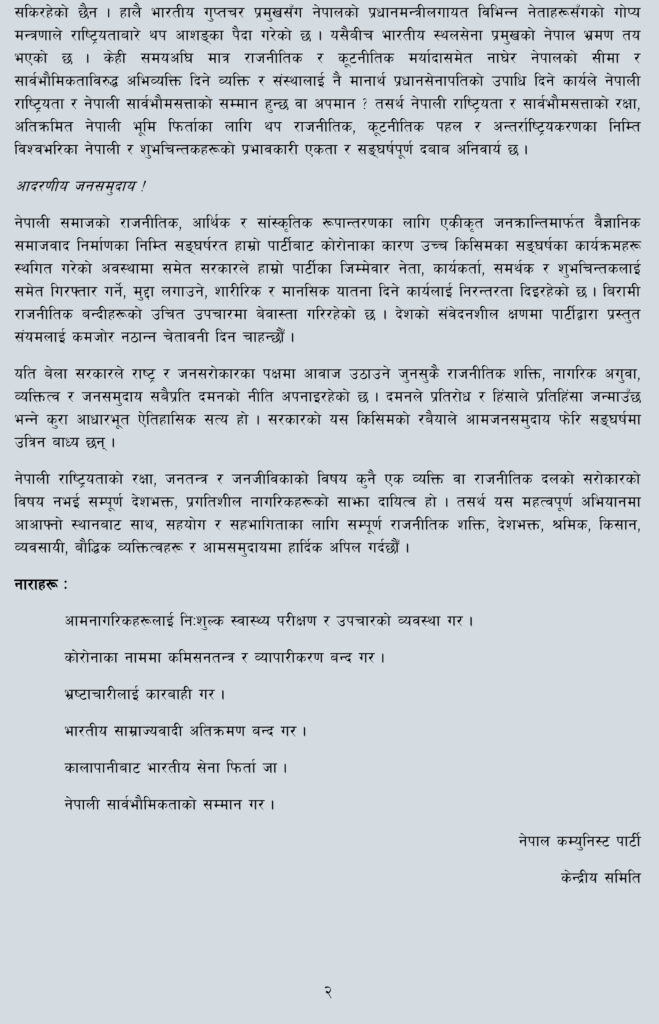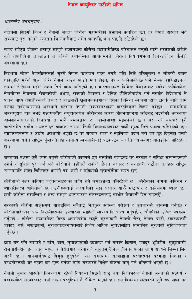 उक्त पार्टीको केन्द्रीय कमिटीले आज एक अपिल जारी गर्दै कोरोनाका नाममा कमिसनतन्त्र र व्यापारीकरण बन्द गर्न, भ्रष्टाचारीलाई कारबाही गर्न, भारतीय साम्राज्यवादी अतिक्रमण बन्द गर्न पनि माग समेत गरेको छ । प्रतिबन्धित नेकपाले कोरोनाको कहर कतिपय पहुँचवालाहरूका लागि ‘कमाउधन्दा’ बनिरहेको दाबी गर्दै कोरोना सम्बन्धित र अन्य सम्पूर्ण भ्रष्टाचारमा संलग्नहरूलाई चेतावनीसमेत दिएको छ ।