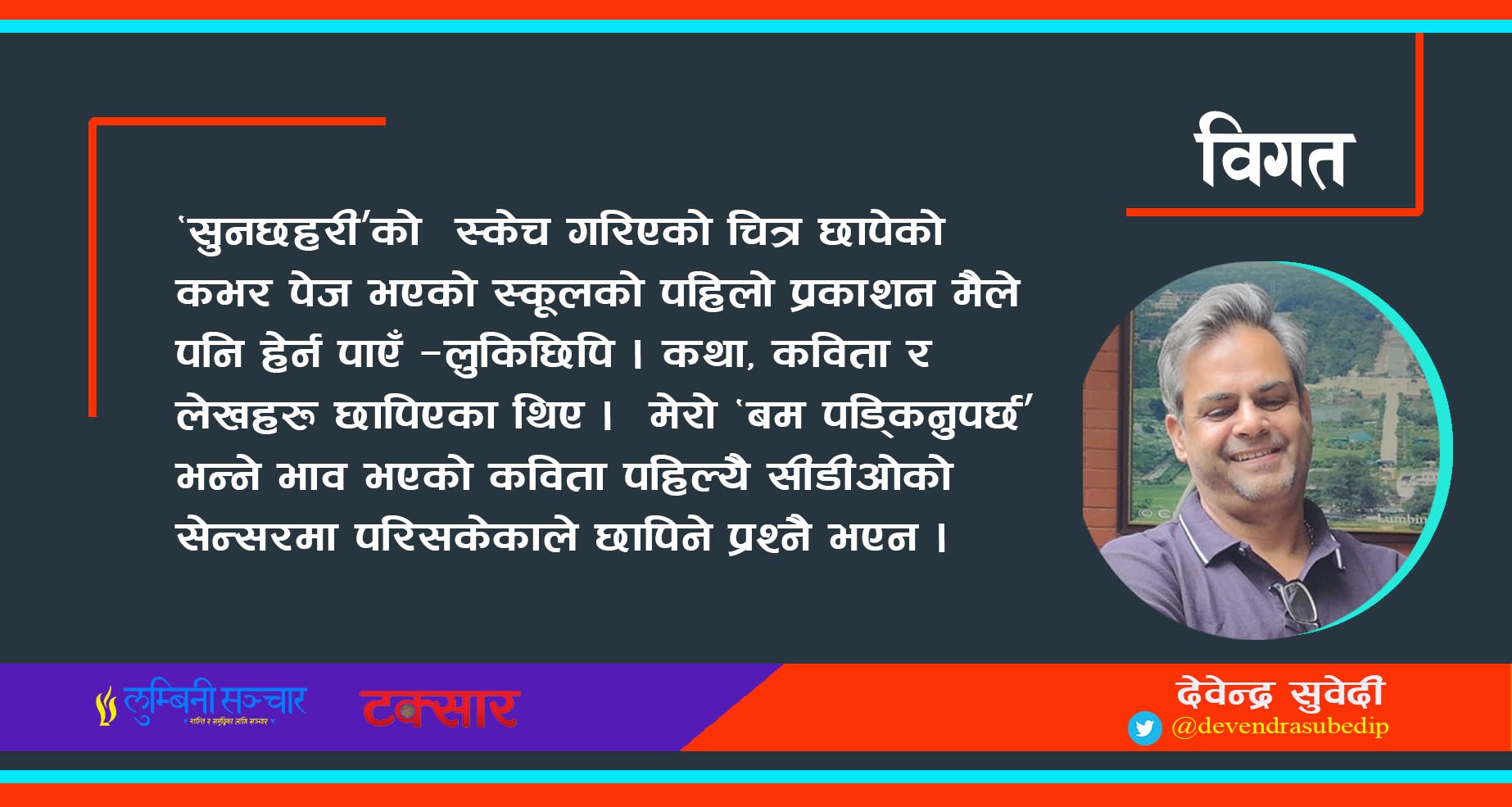 ‘आजसम्म कसैले सोधेको थिएन– त्यो शान्त रूपमा प्रजातान्त्रिक विचारधारा बोकेको युवाले किन त्यसरी लेख्यो ? किन मुद्दा लाग्यो ? र, त्यसपछि के भयो भनेर ? ४४ वर्षपछि तपाईले सोध्नुभयो देवन्द्र भाइ । मैले बताएँ,— मेरो बोझ हल्का भयो, थ्याङ्कयू भाई !’