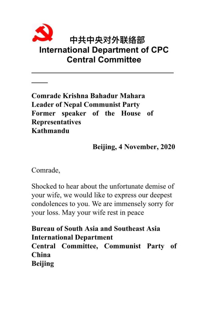 चिनियाँ कम्युनिष्ट पार्टीले पूर्वसभामुख कृष्णबहादुर महरालाई समवेदना पत्र पठाएको छ । चिनियाँ कम्युनिष्ट पार्टीको अन्र्राष्ट्रिय विभागले पूर्वसभामुख महरालाई समवेदना पत्र पठाउँदै जीवन संगीनीको निधनप्रति निधनप्रति दुःख व्यक्त तथा समवेदना प्रकट गरेको हो ।