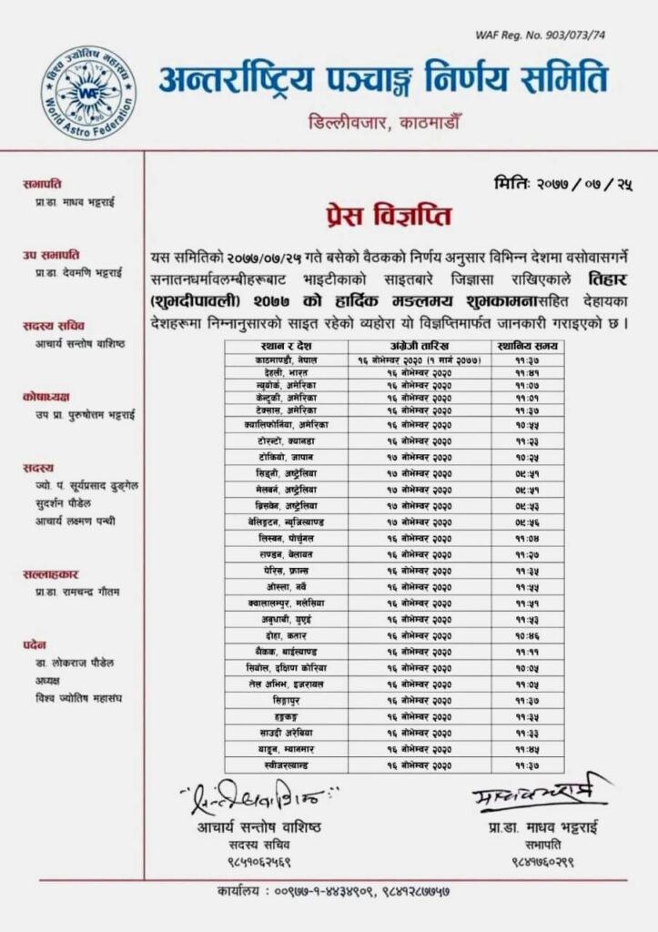 “भाइटीकाको टीका आज दिनभर लगाउन कुनै बाधा नभए पनि साइत खोज्नेका लागि बिहान ११स:३७ बजेको अभिजित मुहूर्तको समय उत्तम छ। भाइटीका लगाउन मध्याह्न हुनुपर्ने भएकाले यो समय निकालिएको हो,” उनले भने।