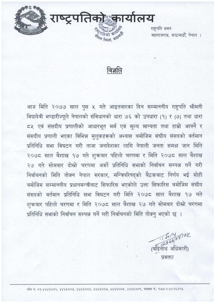 “संविधानको धारा ७६ को उपधारा (१) र (७) तथा धारा ८५ एवं संसदीय प्रणालीको आधारभूत मर्म एवं मूल्य मान्यता तथा हाम्रो आफ्नै र संसदीय प्रणाली भएका विभिन्न मुलुकहरूको अभ्यास बमोजिम संघीय संसदको वर्तमान प्रतिनिधि सभा विघटन गरी ताजा जनादेशका लागि नेपाली जनता समक्ष जान मिति २०७८ साल वैशाख १७ गते शुक्रबार पहिलो चरणमा र मिति २०७८ साल बैशाख २७ गते सोमबार दोस्रो चरणमा अर्को प्रतिनिधि सभाको निर्वाचन सम्पन्न गर्ने गरी निर्वाचनको मिति तोक्न नेपाल सरकार, मन्त्रिपरिषद्को बैठकबाट निर्णय भई सोही बमोजिम सम्माननीय प्रधानमन्त्रीबाट सिफारिस भएकोले उक्त सिफारिस बमोजिम संघीय संसदको वर्तमान प्रतिनिधि सभा विघटन गरी मिति २०७८ साल वैशाख १७ गते शुक्रबार पहिलो चरणमा र मिति २०७८ साल वैशाख २७ गते सोमबार दोस्रो चरणमा प्रतिनिधि सभाको निर्वाचन सम्पन्न गर्ने गरी निर्वाचनको मिति तोक्नु भएको छ,” राष्ट्रपति कार्यालयको विज्ञप्तिमा भनिएको छ।