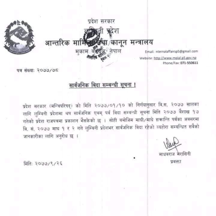 मन्त्रालयको सूचनामा भनिएको छ,” सोही बमोजिम माघी माघे सक्रान्ति पर्वका अवसरमा वि.सं. २०७७ माघ १ र २ गते लुम्बिनी प्रदेशभर सार्वजनिक विदा रहेको व्यहोरा सम्बन्धित सबैको लागि अनुरोध छ ।”