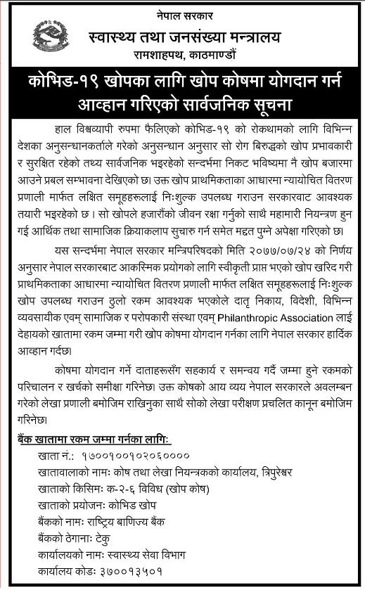 लक्षित समूहहरुलाई निःशुल्क खोप उपलब्ध गराउन ठूलो रकम आवश्यक भएको भन्दै स्वास्थ्य मन्त्रालयले दातृ निकाय, विदेशी, विभिन्न व्यवसायीक एवं सामाजिक र परोपकारी संस्था लगायतलाई रकम जम्मा गरिदिन भन्दै खाता उपलब्ध गराएको छ । रकम जम्मालाई सरकारले ‘योगदान’ भनेको छ ।