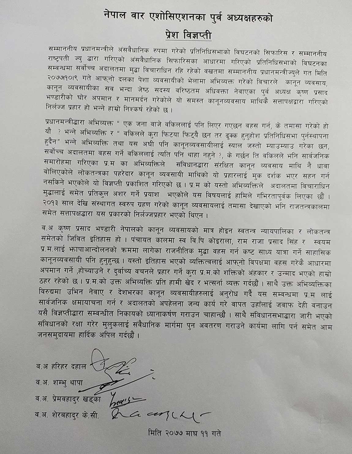 काठमाडौं । प्रधानमन्त्री केपी ओलीबाट वरिष्ठ अधिवक्ता कृष्णप्रसाद भण्डारीको अपमान र मानमर्दन भएको भन्दै नेपाल बार एशोसिएसनका चार जना पूर्वअध्यक्षहरुले आपत्ती जनाएका छन् ।