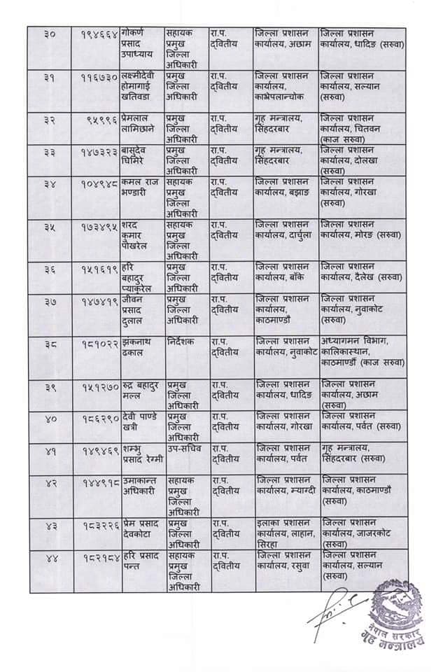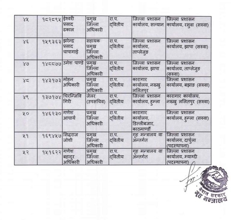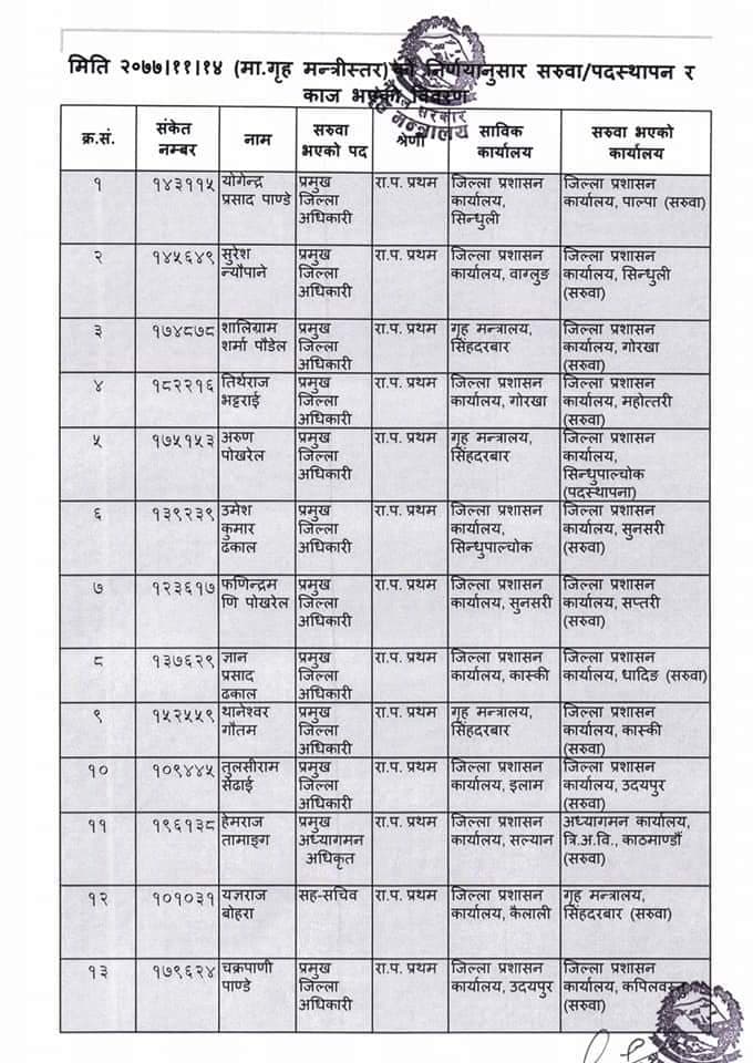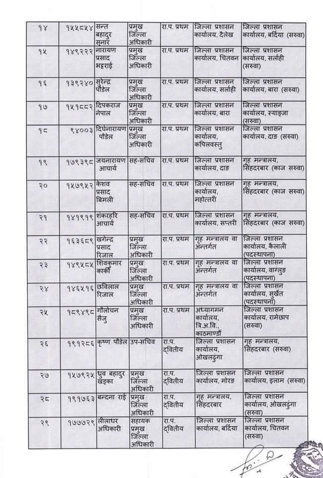 गृह मन्त्रालयद्धारा प्रमुख जिल्ला अधिकारीहरूको सरुवा, दाङमा पौडेल (सूचीसहित)