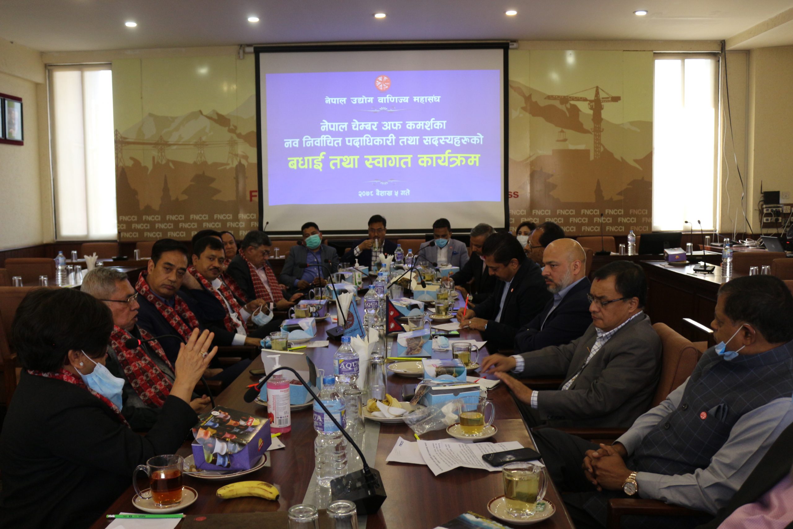 नेपाल उद्योग वाणिज्य महासंघद्वारा नेपाल चेम्वर अफ कमर्सको हालै सम्पन्न ७० औं वार्षिक साधारण सभाबाट निर्वाचित अध्यक्ष सहित पदाधिकारीहरूको स्वागतमा आज महासंघ सचिवालयमा आयोजित कार्यक्रममा दुबै संस्थाका नेतृत्वको कुरामा जोड दिइएको हो ।
