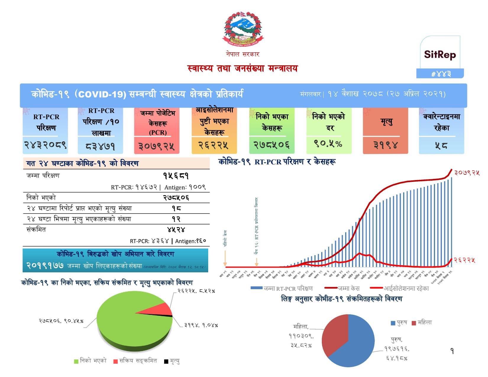मन्त्रालयका अनुसार पछिल्लो २४ घण्टामा पीसीआर र एन्टिजेन दुवै विधिबाट गरिएको परीक्षणमा थप ४ हजार ५२४ जनामा संक्रमण पुष्टि भएको हो ।