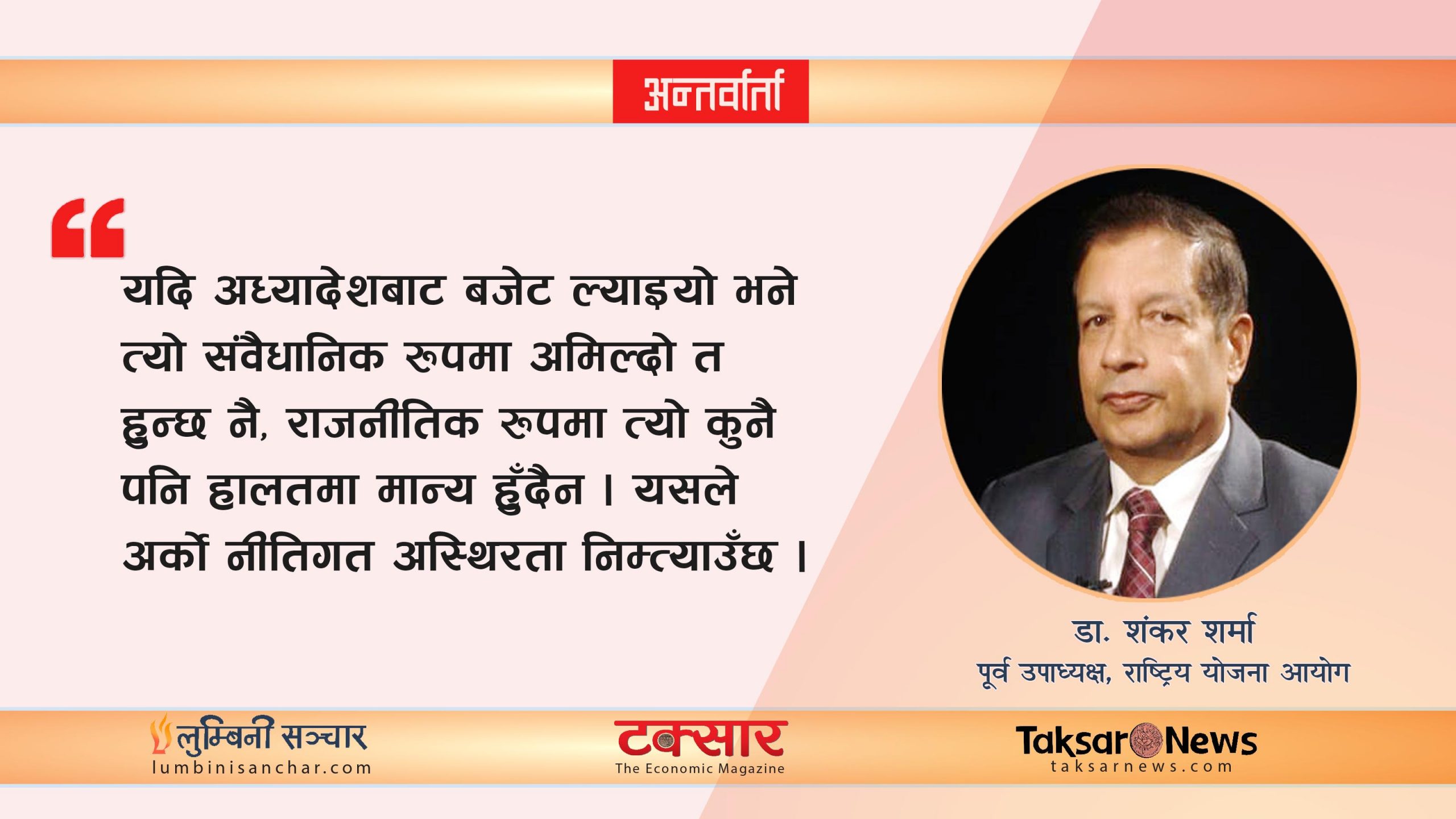 लामो समयदेखि नेपालको आर्थिक विकासका क्षेत्रमा क्रियाशील डा. शंकर शर्मा राष्ट्रिय योजना आयोगको उपाध्यक्ष हुँदै संयुक्त राज्य अमेरिकाका लागि नेपालको राजदूतसमेत रहिसकेका छन् । करिब तीन दशकअघि नेपाल राष्ट्र बैंकको वरिष्ठ आर्थिक सल्लाहकार हुँदै योजना आयोगको सदस्य, उपाध्यक्ष रहिसकेका डा. शर्माले नेपालको बजेट र योजना निर्माण प्रक्रियामा लामो समय बिताएका छन् । राष्ट्र संघीय निकायहरूका लागि समेत आर्थिक अनुसन्धानमा संलग्न डा. शर्मा नेपालको विद्यमान बजेट निर्माण प्रक्रियामै त्रुटि भएकाले यसको कार्यान्वयनमा समस्या रहेको बताउँछन् । डा. शर्मासँग टक्सार मिडिया ग्रुपका समूह सम्पादक गजेन्द्र बुढाथोकीले गरेको कुराकानीः