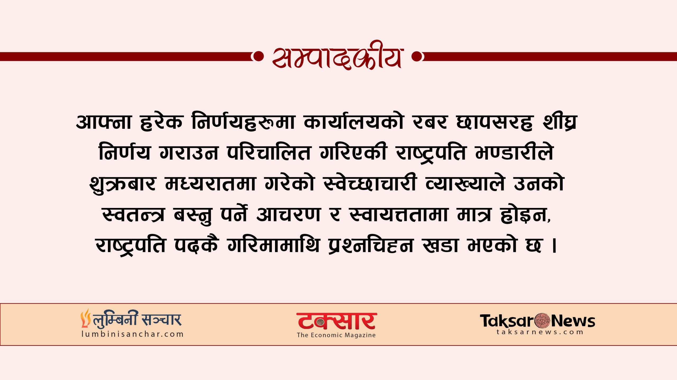 पार्टीभित्रको आन्तरिक विवाद मिलाउन नसक्दा गत पुसमा नै संसद विघटन गराएका प्रधानमन्त्री ओलीको शकुनी चालको चक्रब्यूहमा मुलुक फँसेको छ । आफ्ना हरेक निर्णयहरूमा कार्यालयको रबर छापसरह शीघ्र निर्णय गराउन परिचालित गरिएकी राष्ट्रपति भण्डारीले शुक्रबार मध्यरातमा गरेको स्वेच्छाचारी व्याख्याले उनको स्वतन्त्र बस्नु पर्ने आचरण र स्वायत्ततामा मात्र होइन, राष्ट्रपति पदकै गरिमामाथि प्रश्नचिह्न खडा भएको छ ।