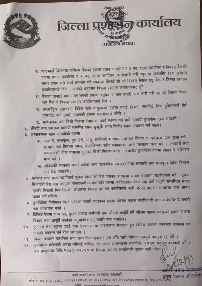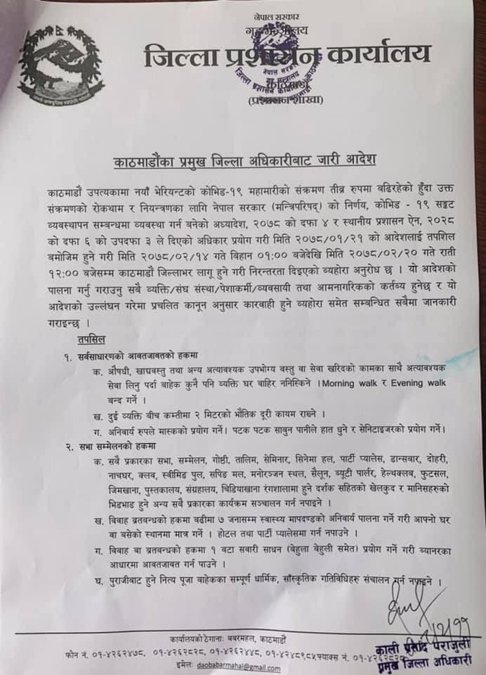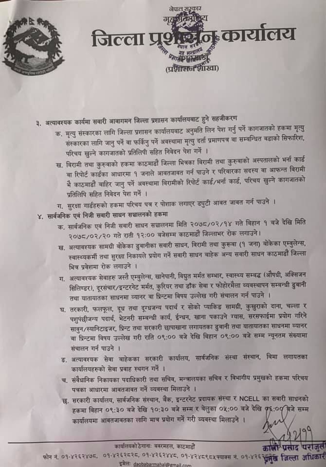 निषेधाज्ञालाई थप कडाइ गरिएको छ । मर्निङ वाक इभिनिङ वाकमा निस्कन नपाइने, अत्यावस्यक काम नपरी घर बाहिर निस्कन नपाइने व्यवस्था गरिएको छ ।