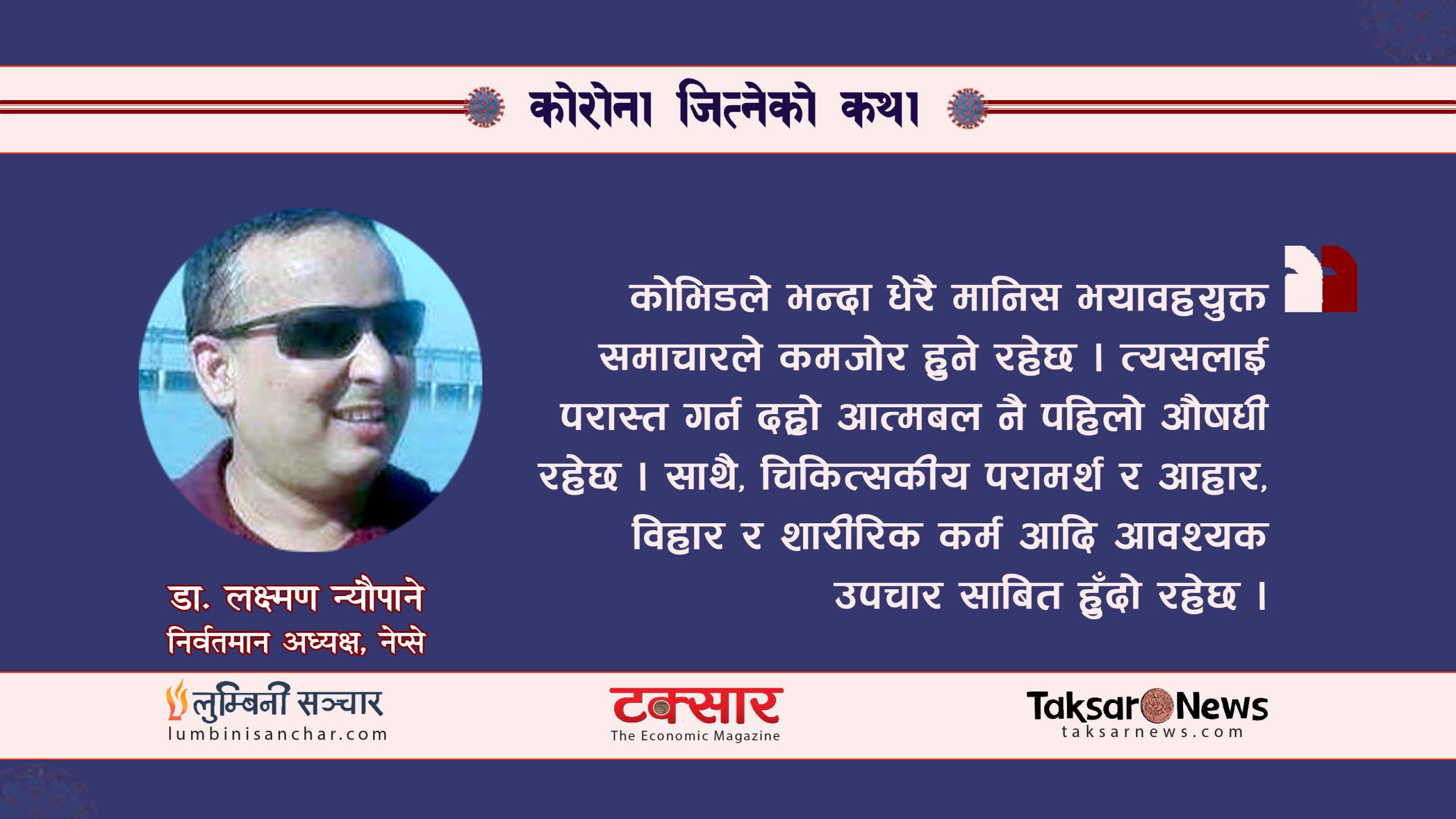 अन्ततः जेठको ९ गते पीसीआर चेकजाँच गरायौं, नगेटिभ आयो । त्यसपछि पनि स्वास्थ्य सर्तकर्ता अपनाउँदै आएका छौं । कोभिडले भन्दा धेरै मानिस भयावहयुक्त समाचारले कमजोर हुने रहेछ । त्यसलाई परास्त गर्न दह्रो आत्मबल नै पहिलो औषधी रहेछ । साथै, चिकित्सकीय परामर्श र आहार, विहार र शारीरिक कर्म आदि आवश्यक उपचार साबित हुँदो रहेछ । त्यसैले कसैले पनि कोरोनालाई ए, त्यो सामान्य त होनी भनेर हेलचक्रायाई नगरौं ।