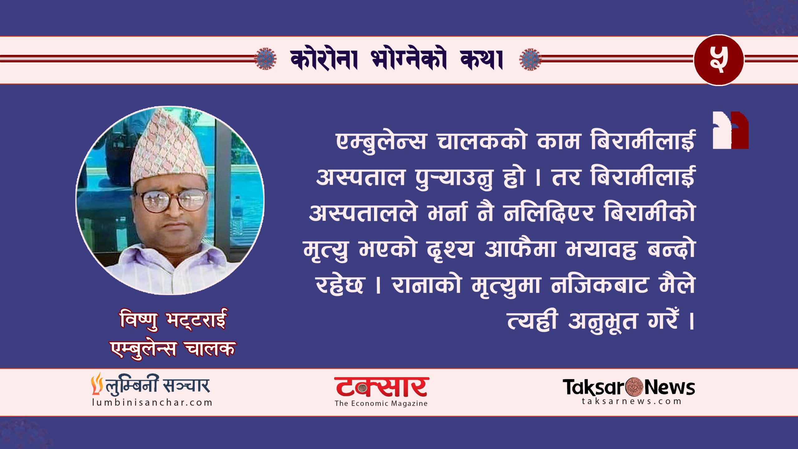 म विष्णु भट्टराई । कपिलवस्तु जेसिजद्वारा सञ्चालित एम्बुलेन्सको चालक । करिब ८ वर्षदेखि एम्बुलेन्स चालक छु । अहिलेको कोरोना महामारीमा पनि मैले आफ्नो सेवा प्रवाह गरिरहेको छु । यस अवधिमा अग्र पंक्तिमा खट्ने पेशाकर्मीमध्ये हामी एम्बुलेन्स चालक पनि हौं ।