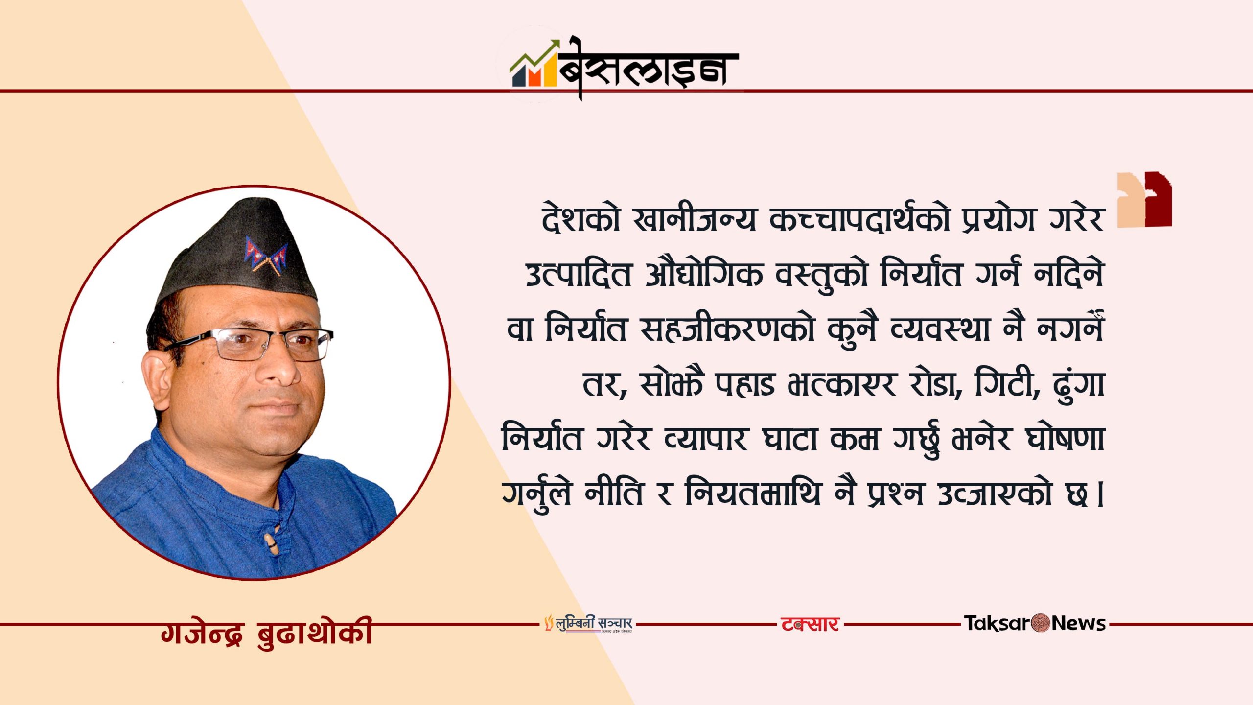 अहिलेकै सीमित वस्तु र उत्पादनको डालो लिएर मुलुकको व्यापार घाटा कम गर्ने भन्न सकिने अवस्था छैन । एउटा उत्पादन रोकिए, म अर्को चोरबाटोबाट निर्यात गरेर रातारात कमाइ हाल्छु नि प्रवृत्तिले पनि व्यापार घाटाको तराजु माथि उकालिने वाला छैन ।अर्को देशको अर्ध-तयारी वस्तु ल्याउँदै ‘मेड इन नेपाल’को छाप मार्दै नेपाली उत्पादन हो भनेर छिमेकी मुलुकहरूको भन्सार र कर अन्तरको फाइदा उठाउँदै आफूलाई निर्यात उद्यमी कहलाउनेहरूको जमात एकातिर छ भने अर्कातिर देशको नदीनाला, पहाड, जंगललायतका अमूल्य निधि कौडीको भाउमा बेचेर ‘राष्ट्रवादी सरकार’लाई समृद्धिको झोला भिडाउन तयार अर्को समूह छ, किनकी सत्तारुढ दलको दरबार बन्दैछ ।