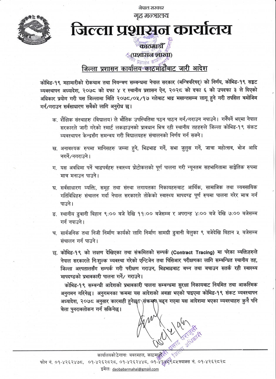 त्यस्तै प्रशासनले अनावश्यक रूपमा भीडभाड नगर्ने,सभा, जुलुस, जात्रा, महोत्सव आदि नगर्ने नराउने भनेको छ । त्यस्तै बैठकले भदौ १७ गतेदेखि भदौ मसान्त सम्म निषेधाज्ञा जारी गरेको छ ।