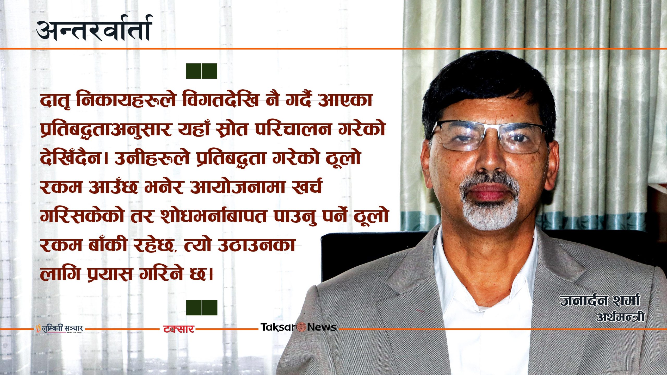 केपी ओली नेतृत्वको सरकारले विघटन गरेको प्रतिनिधि सभा पुनर्स्थापना भएपछि २०७८ असार ३० गते नेपाली कांग्रेसका सभापति शेरबहादुर देउवाको नेतृत्वमा गठन भएको सरकारमा माओवादी केन्द्रका तर्फबाट जनार्दन शर्मा अर्थमन्त्री नियुक्त भए । यसअघि गृह र ऊर्जा मन्त्रालय सम्हालिसकेका शर्माले अर्थमन्त्री भएलगत्तै कोभिड–१९ ले संकटमा परेको अर्थतन्त्रका लागि पुनरुद्धार कार्यक्रम ल्याउने घोषणा गरेका छन् । अर्थमन्त्री शर्मासँग टक्सार मिडिया समूहका प्रधान-सम्पादक गजेन्द्र बुढाथाेकीले गरेको कुराकानीको सम्पादित अंशः