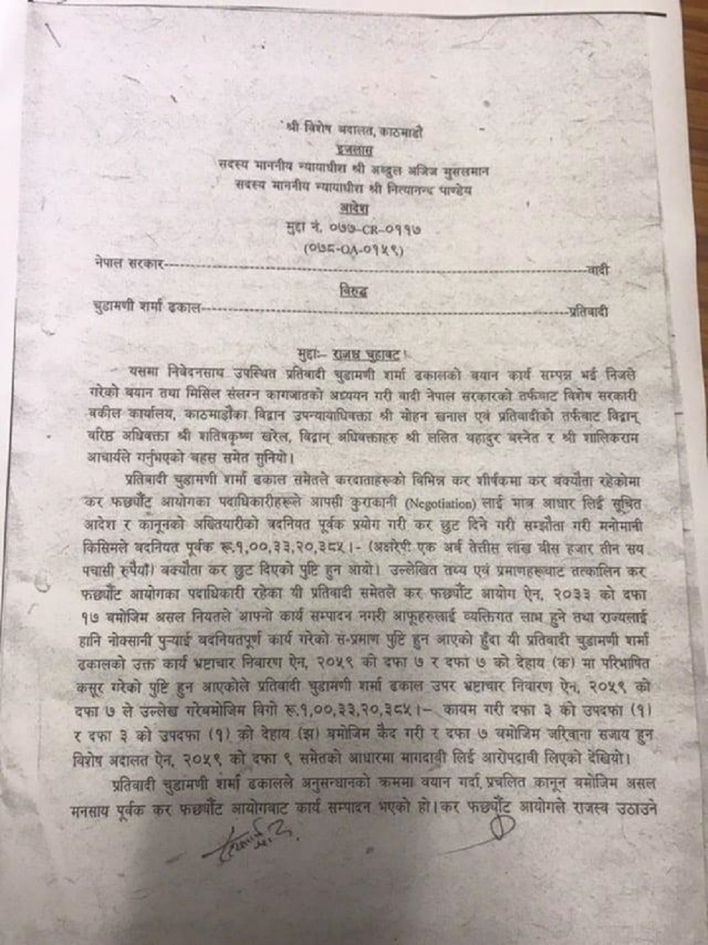 काठमाडौं । कर छुट दिएको आरोप लागेका चूडामणि शर्मा ढकाललाई विशेष अदालतले ५० लाख रुपैयाँ धरौटी माग गरेको छ ।