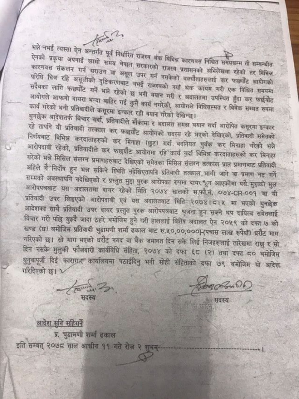 १ अर्ब ३३ लाख २० हजार ३ सय ८५ रुपैयाँ कर छुट दिएको आरोप लागेका शर्मालाई विशेष अदालतका न्यायाधीश अब्दुल अजिज मुसलमान र नित्यानन्द पाण्डेयको इजलासले शर्मासँग ५० लाख रुपैयाँ धरौटी माग गरेको हो ।