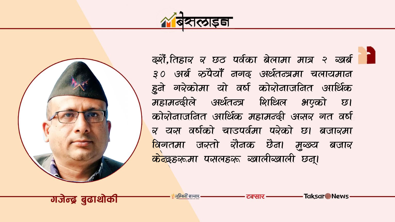 कोरोनाजनित आर्थिक महामन्दी असर गत वर्ष र यस वर्षको प्रमुख र ठूला चाडपर्वमा परेको छ । बजारमा विगतमा जस्तो रौनक छैन । मुख्य बजार केन्द्रहरूमा पसलहरू खालीखाली छन् । महामन्दीको सिकार भएका गरिब र तल्लो मध्यम वर्गसँग खर्च गर्नयोग्य बचत नभएकाले घरपरिवारहरूमा चरम निराशा देखिएको छ । भएको बचत ती लकडाउन र निषेधाज्ञाहरूमा खाद्यान्न किनेर खाँदैमा खर्च भएको अनि रोजगारी, पेशा–व्यवसाय तथा आयआर्जनमा गम्भीर असर पारेका कारणले पुनः आर्थिक क्रियाकलाप पुनर्बहाल गर्न अधिकांश नेपाली अहिले असथर्म भएका छन् ।
