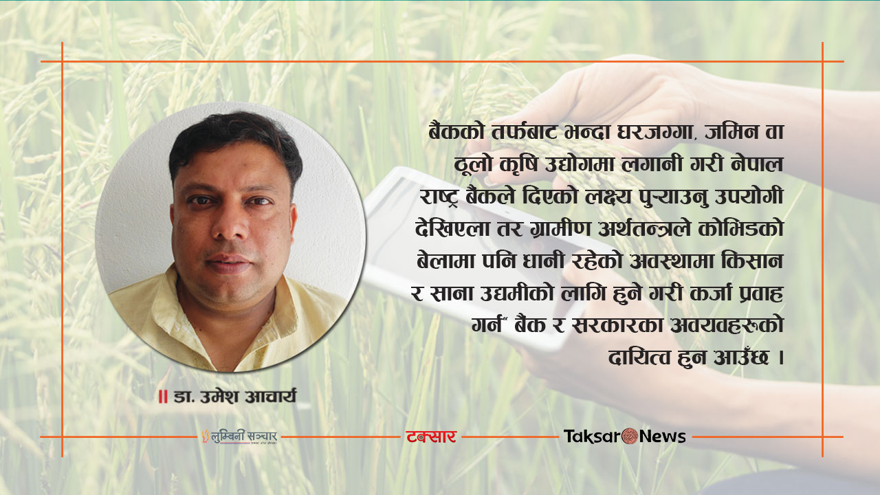बैंकको तर्फबाट भन्दा घरजग्गा, जमिन वा ठूलो कृषि उद्योगमा लगानी गरी नेपाल राष्ट्र बैंकले दिएको लक्ष्य पु-याउनु उपयोगी देखिएला तर ग्रामिण अर्थतन्त्रले कोभिडको बेलामा पनि धानीरहेको अवस्थामा किसान र साना उद्यमीको लागि हुने गरी कर्जा प्रवाह गर्नु बैंक र सरकारका अवयवहरूको दायित्व हुन आउँछ।