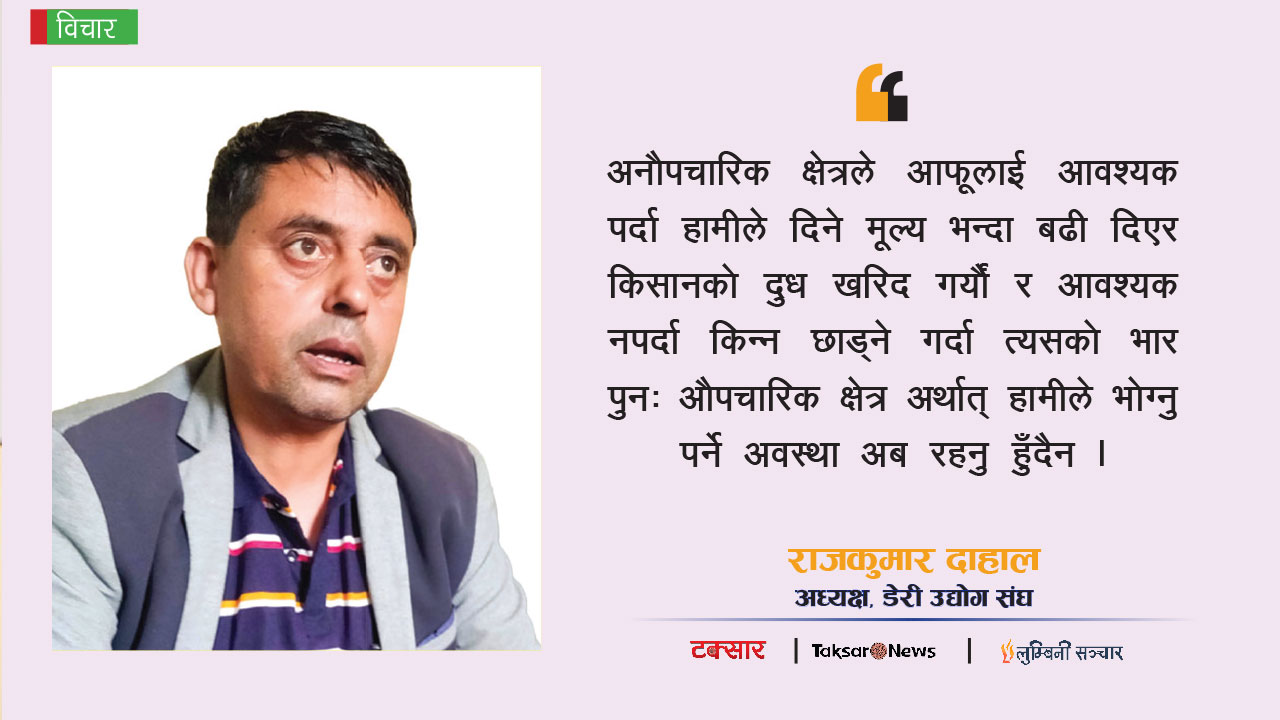 दूध अनौपचारिकरूपमा छरिएको भने कहीँकतै समस्या भयो भने गाली खानुपर्ने हामी औपचारिक क्षेत्र नै हुन्छौँ । सरकारले ढिला नगरी अनौपचारिक क्षेत्रको दुग्ध कारोबारलाई औपचारिक क्षेत्रमा ल्याउनुु पर्ने हुन्छ । नियमन गर्नुपर्ने हुन्छ । एकातिर भएका उद्योग क्षमतामा नचल्ने र बिना अध्ययन नयाँ उद्योग खुल्ने काम भइरहको छ । यो पनि राम्रो हैन । राज्यको ध्यान पुुग्नु पर्छ ।