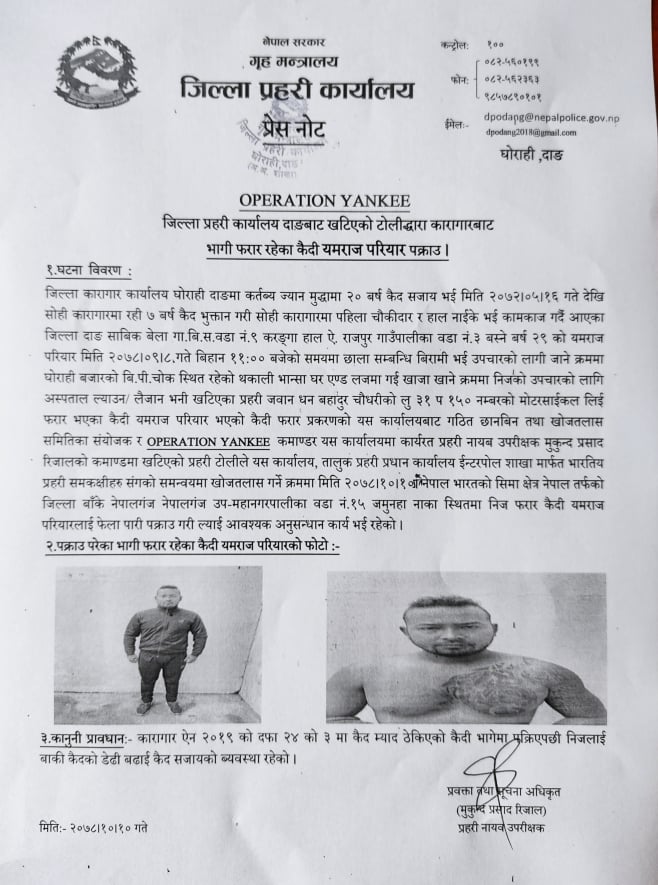 घोराही । दाङबाट भागेका कैदी यमराज परियारलाई बाँकेको जमुनाह नाकाबाट पक्राउ परेका छन् । परियार जिल्ला कारागार कार्यालय दाङमा कर्तब्य ज्यान मुद्दामा २० बर्ष कैद सजाय भई मिति २०७२ भदौ १६ गतेदेखि ७ वर्ष कैद सजाय भोगिसकेका कैदी हुन्।