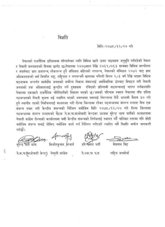 नेकपा माओवादी केन्द्र,नेपाली कांग्रेस,नेकपा एकीकृत समाजवादी र राष्ट्रिय जनमोर्चाको बैठकपछि जारी गरिएको संयुक्त विज्ञप्तिमा भनिएको छ,“रोल्पा जिल्लामा गठबन्धनमा संलग्न दलहरुको बैठक ने.क.पा. माओवादी केन्द्रका अध्यक्ष सुरेन्द्र थापा घर्तीको अध्यक्षतामा नेपाली कांग्रेस रोल्पाको कार्यालयमा बसी केन्द्रीय संयन्त्रको निर्णयलाई स्वागत गर्दै पालिका स्तरमा पनि सोही बमोजिम संयन्त्र बनाई तोकिए बमोजिम कार्य गर्न निर्देशन गरीएको व्यहोरा यसै विज्ञप्ति मार्फत जानकारी गर्दछौँ ।”